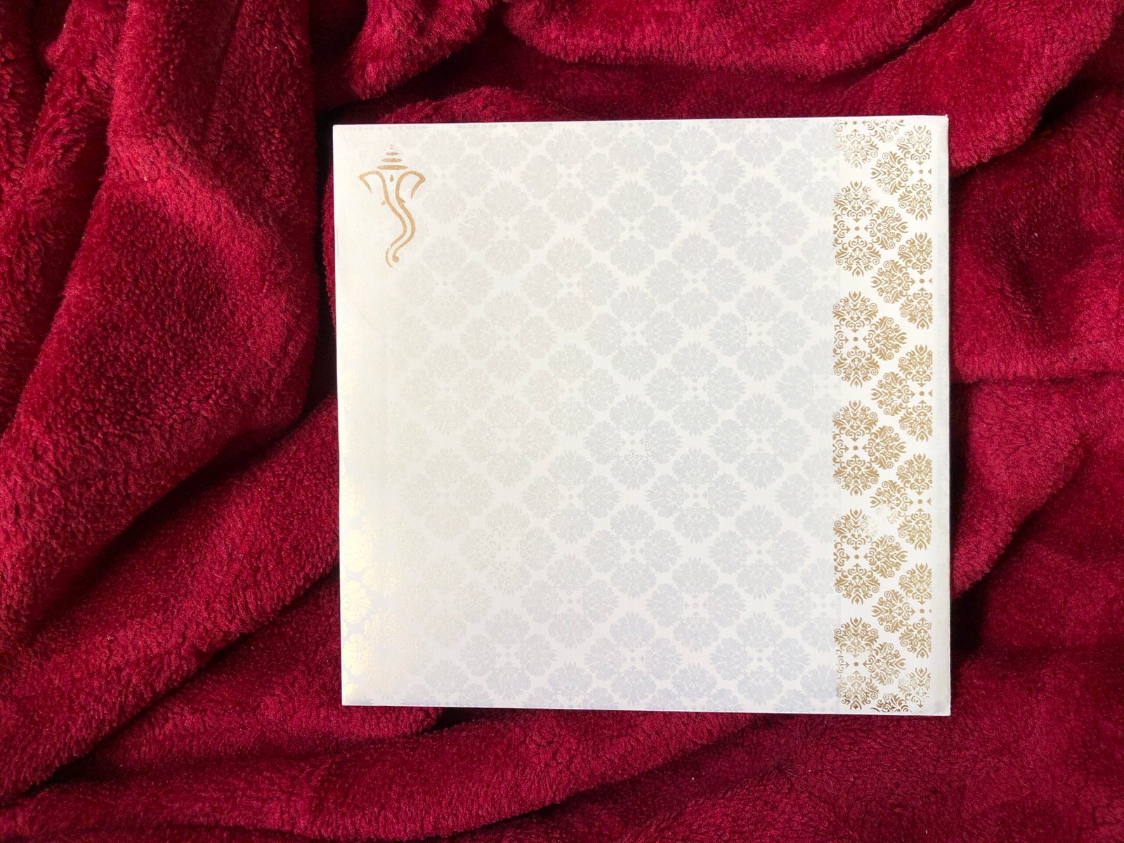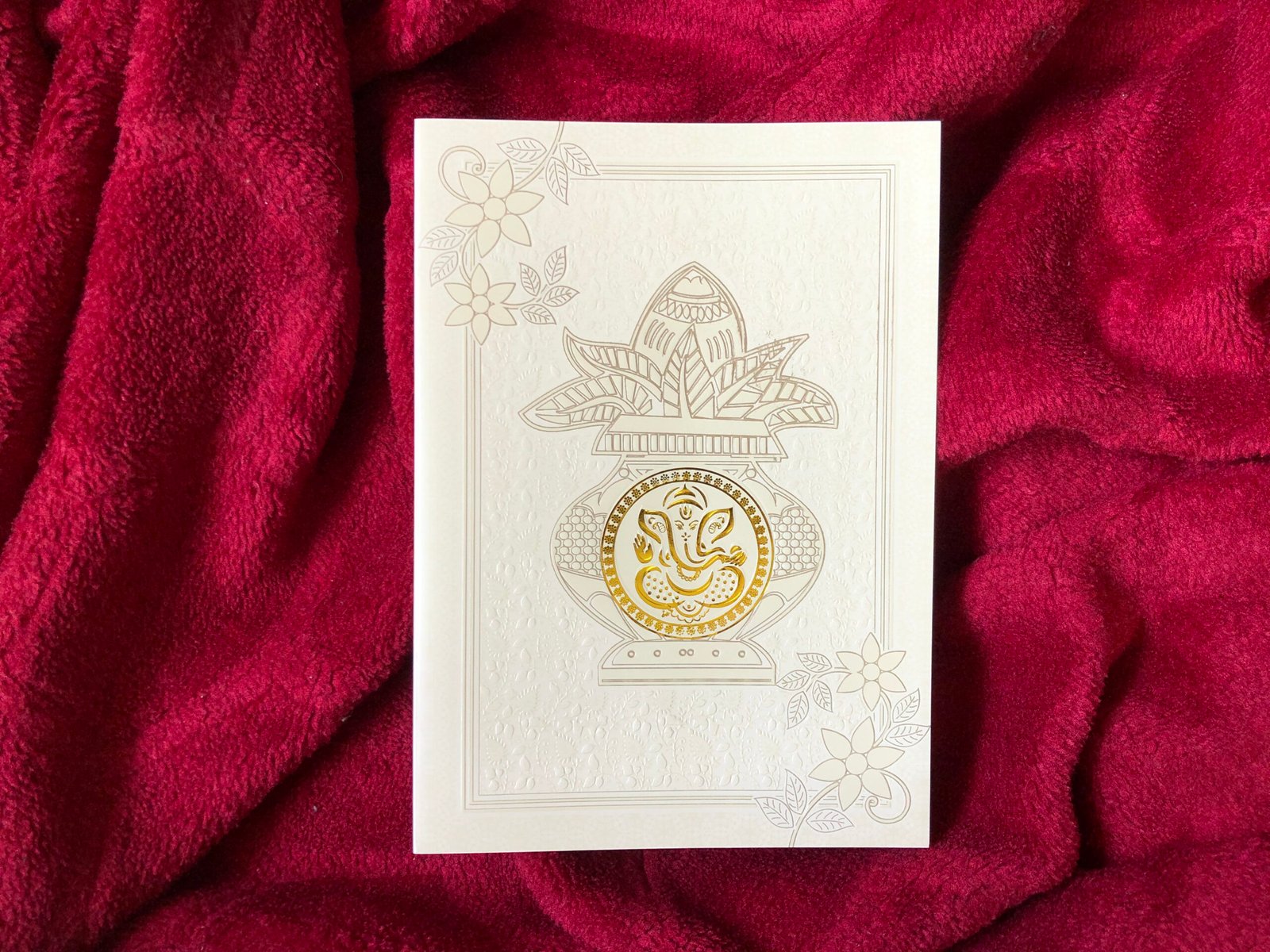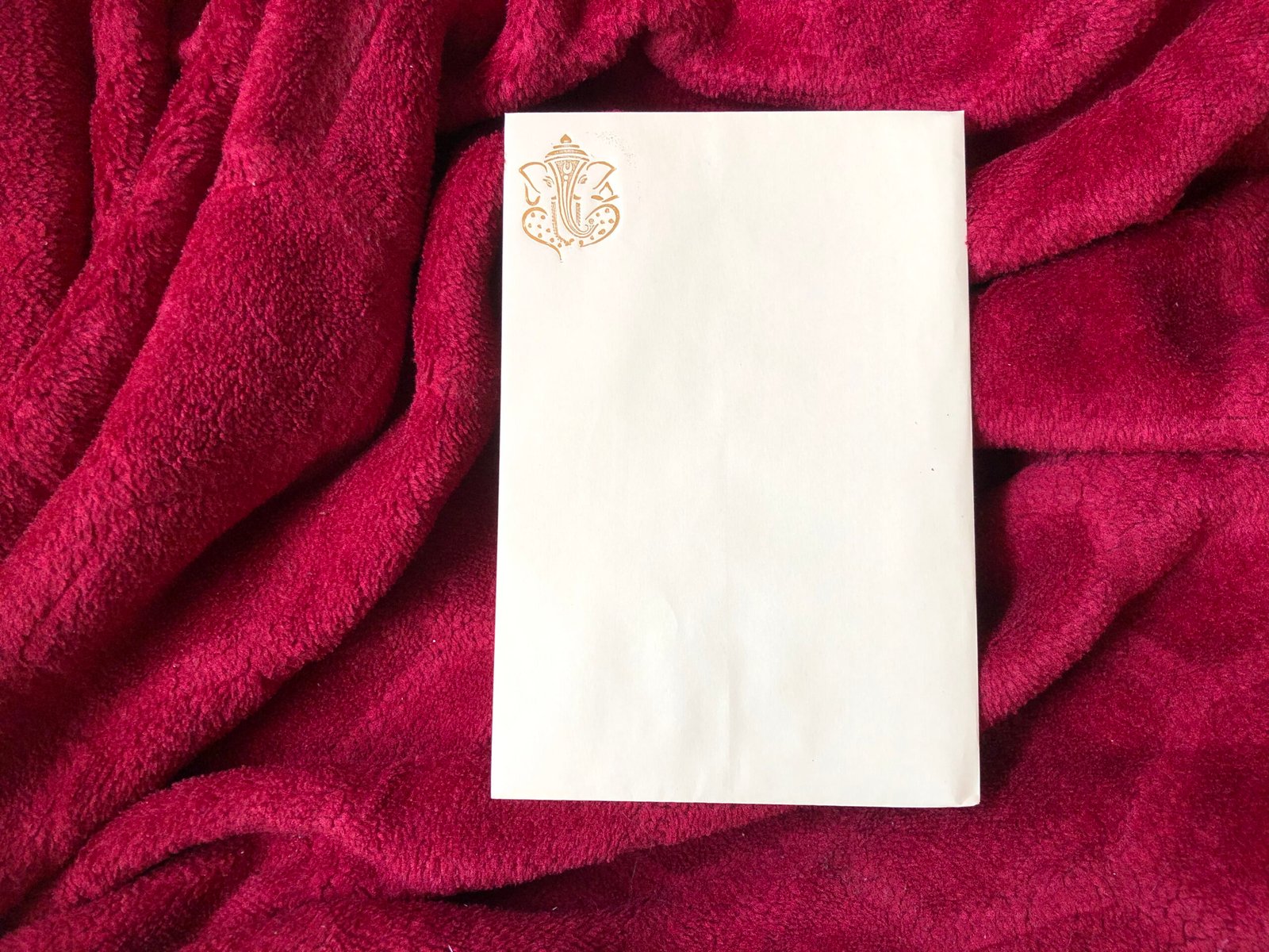 ₹18.00A simple and elegant off-white wedding card with a clean and classic look. The card features golden printing on one side and a Ganesh clipart on the other, giving it a traditional touch. Its minimal design makes it look graceful, neat, and perfect for those who prefer a simple yet stylish wedding invitation.