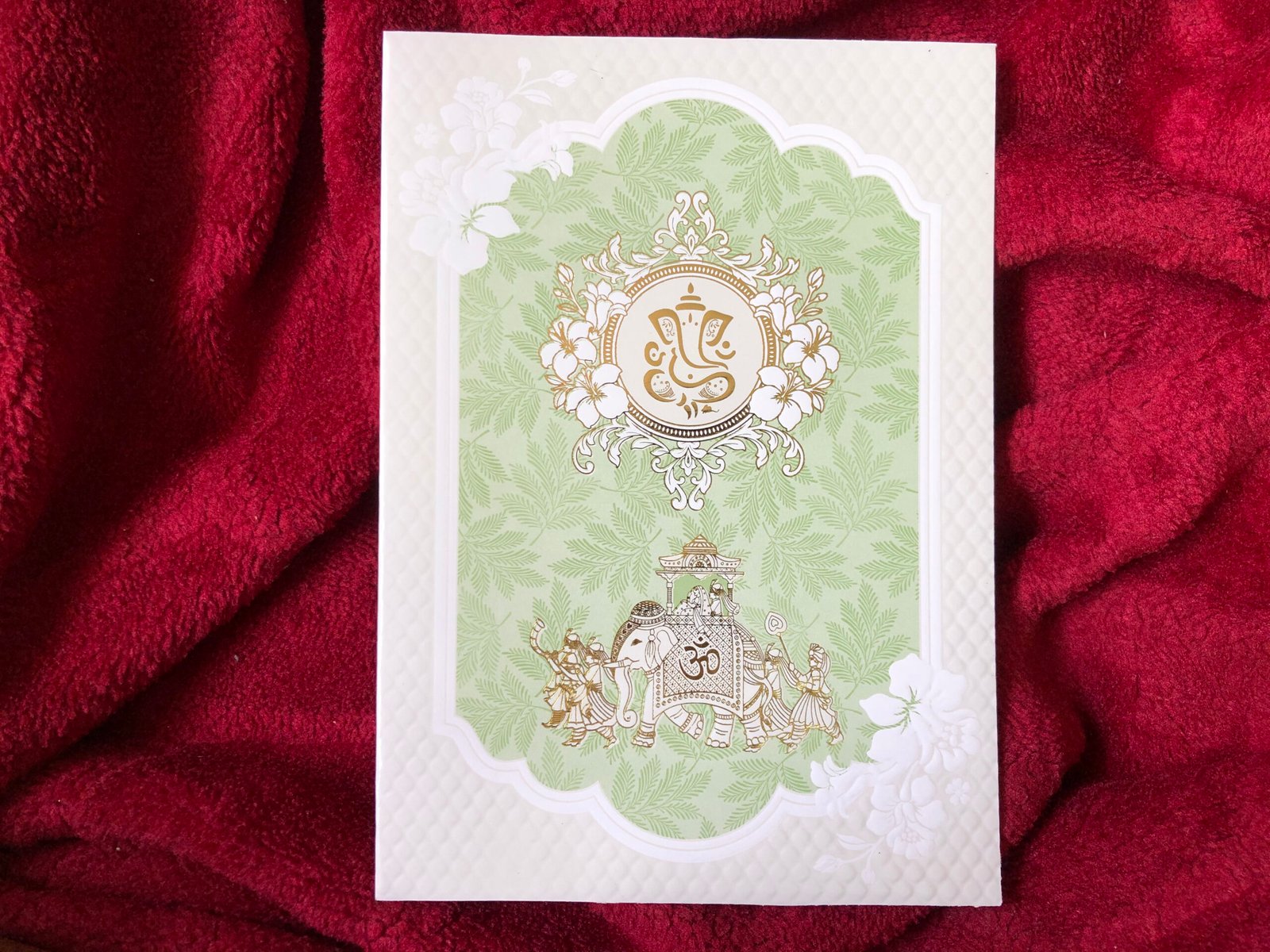 ₹19.00A beautiful light greenish wedding card with delicate floral print, paired with a matching envelope featuring a stylish circle cutout for a modern touch. On the front of the card, a golden Ganesh clipart is placed at the center, symbolizing blessings and auspicious beginnings. The design looks fresh, graceful, and traditional, making it a perfect choice for a charming wedding invitation.