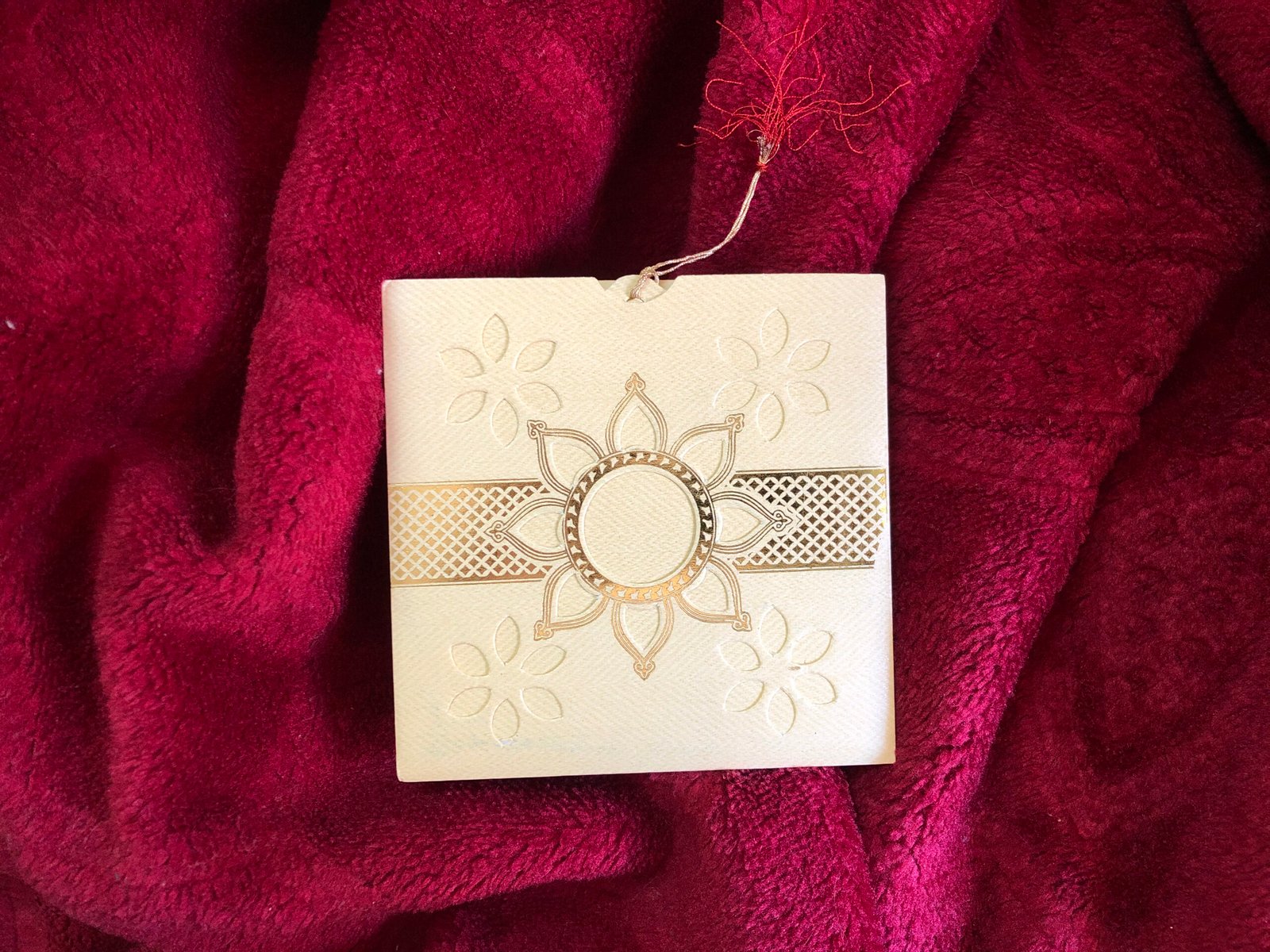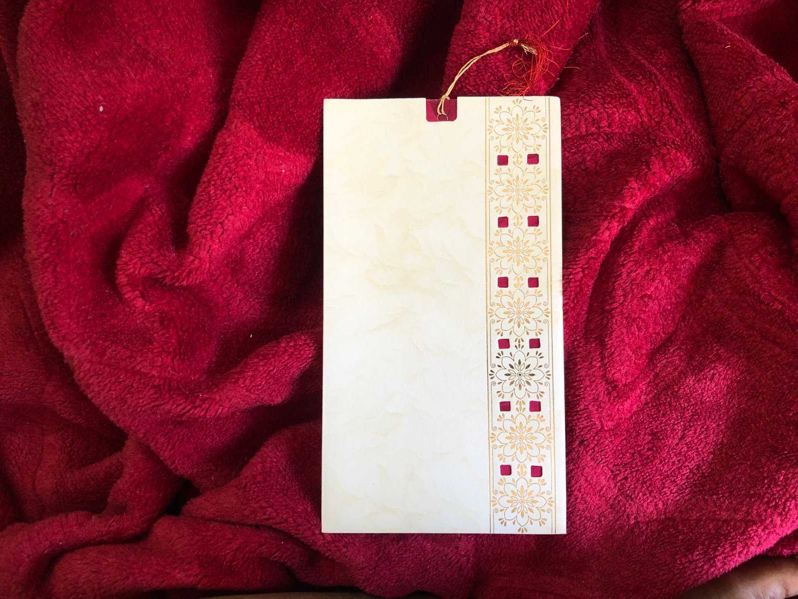 Elegant laser-cut flower design envelope with a neatly folding card, featuring a golden printed border and floral design in the middle, offering a clean, classy, and attractive appearance.