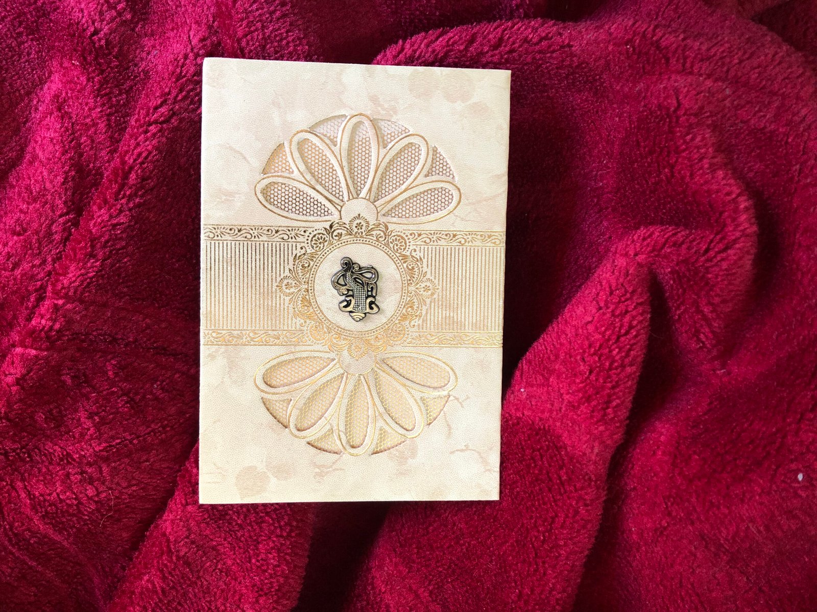 ₹18.00A simple yet elegant cream-colour card with a matching pouch. The card features a beautiful laser-cut floral design, with a Ganesh clipart placed at the center, creating a graceful and divine look. The clean design and fine detailing make this invitation look truly amazing and classy.