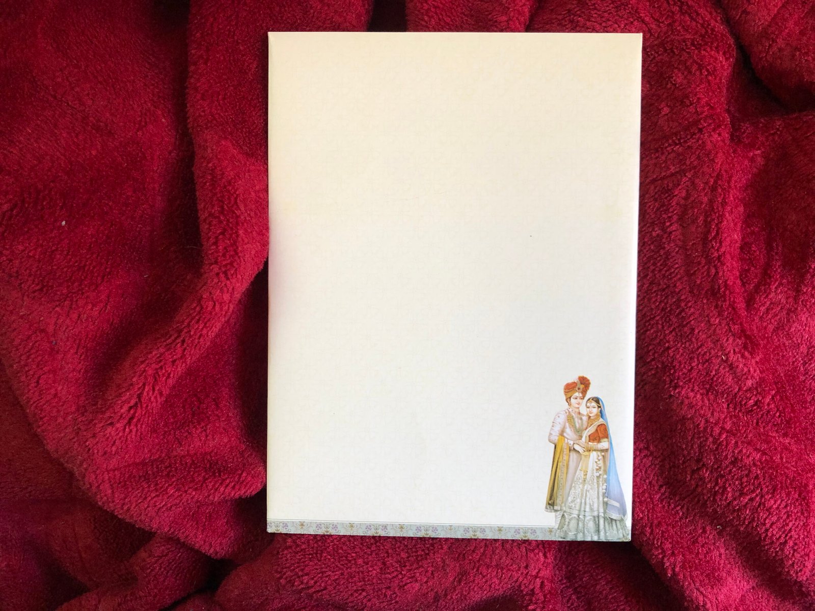 White colour wedding card with elegant floral corner borders on the envelope, giving it a soft and classy look. The envelope also features a traditional bride–groom illustration on the right side bottom, adding a rich Indian touch.