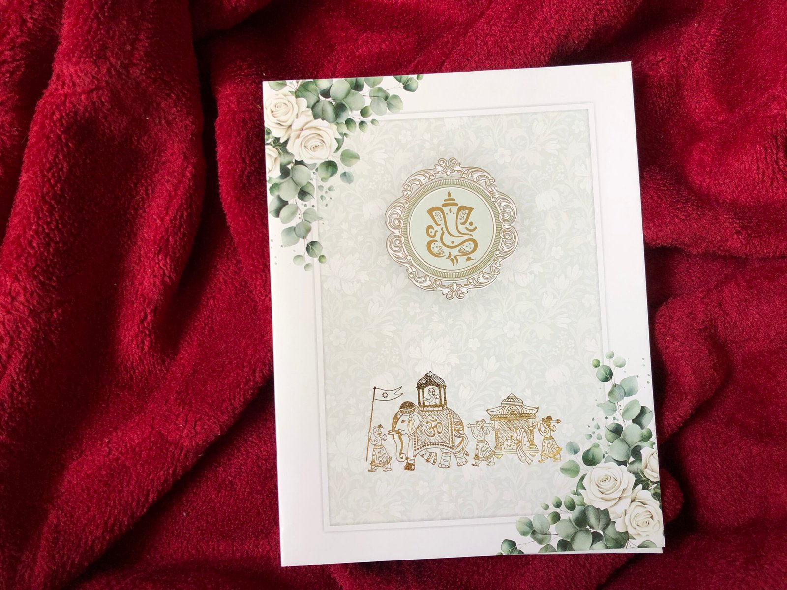 ₹24.00Ideal for couples looking for a wedding card that speaks to their cultural heritage and modern style, this card is a perfect fit for weddings in Margao, Panjim, Mapusa, and across Goa. The classic white color ensures the golden Ganesh and floral details stand out, giving the invitation a timeless elegance that will be cherished by your loved ones.