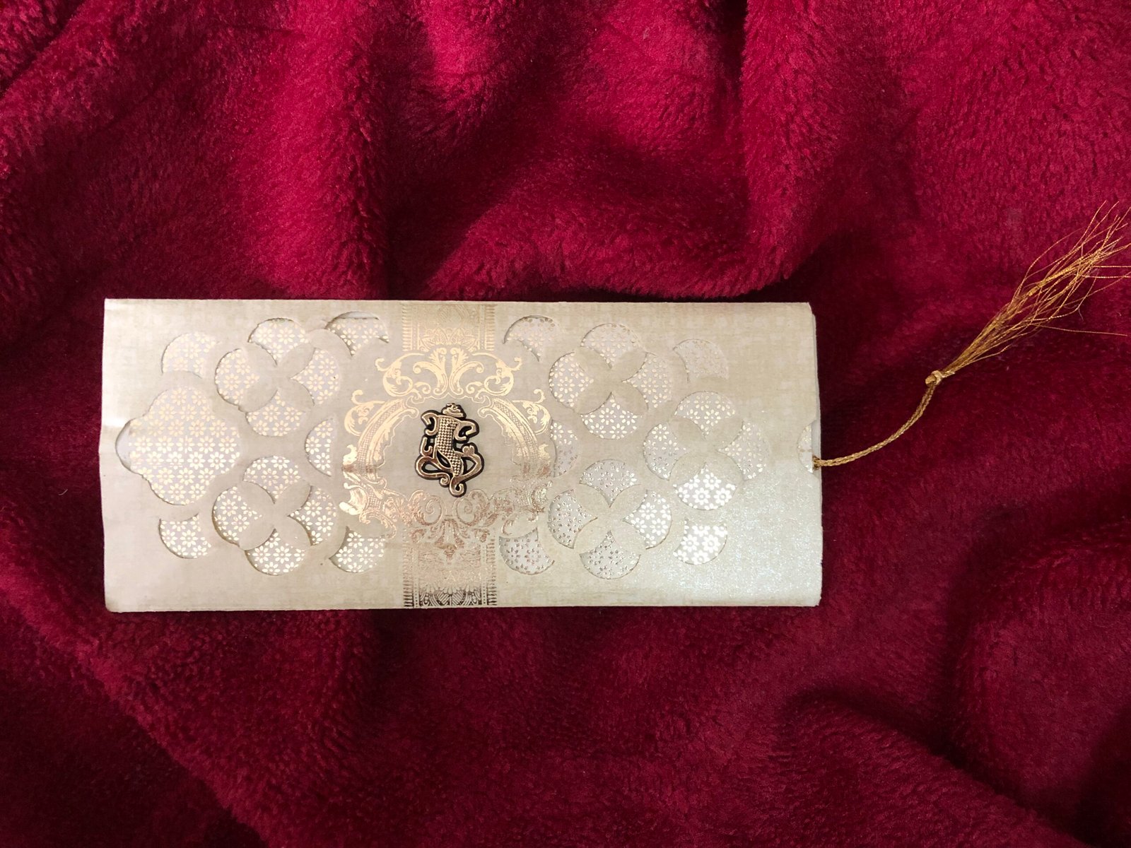 ₹9.00A beautiful cream-coloured laser cut wedding card featuring a golden Ganesh clipart and matching golden print for an elegant traditional touch. Designed in a letter-style pouch format, it is tied with a golden thread, making it look simple yet attractive. Perfect for couples who want a classy and stylish wedding invitation.