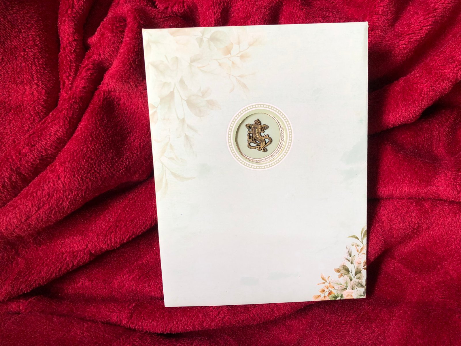 ₹19.00A beautiful light greenish wedding card with delicate floral print, paired with a matching envelope featuring a stylish circle cutout for a modern touch. On the front of the card, a golden Ganesh clipart is placed at the center, symbolizing blessings and auspicious beginnings. The design looks fresh, graceful, and traditional, making it a perfect choice for a charming wedding invitation.