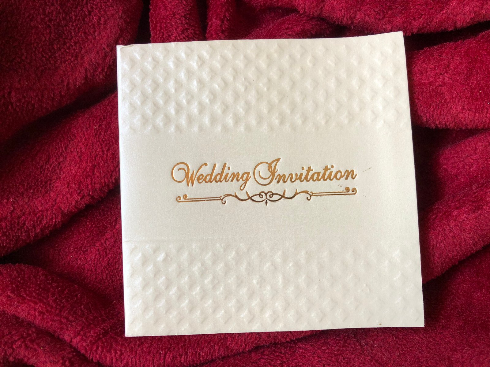 ₹15.00A beautifully crafted wedding invitation designed on a soft cream-coloured card, featuring luxurious gold embossed lettering that adds a royal and timeless touch. The elegant gold detailing enhances the names and event highlights, giving the invitation a classic and sophisticated look. Perfect for a traditional yet modern celebration, this card reflects grace, warmth, and the grandeur of the wedding it announces.