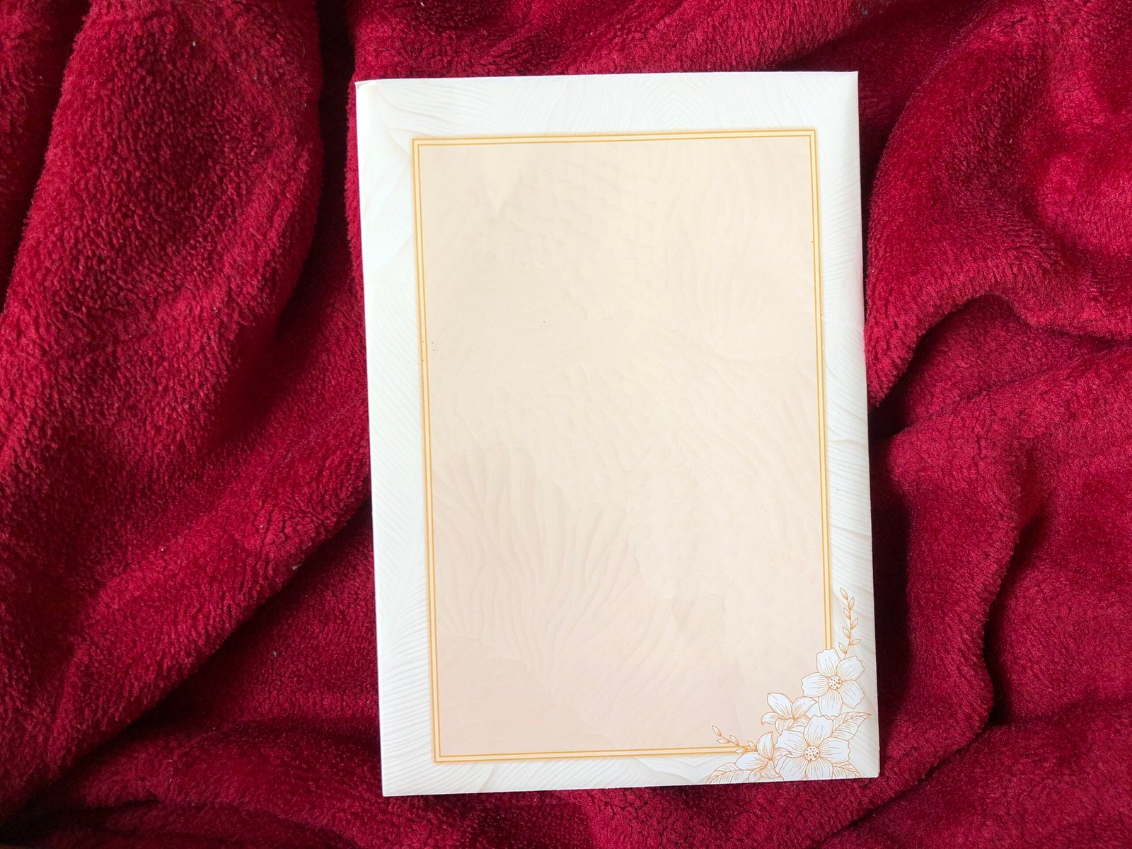 ₹12.00A cream-coloured wedding card featuring a clean and elegant layout, with a subtle print on one side and a golden Ganesh motif on the other, symbolizing blessings and auspicious beginnings. The design is simple yet graceful, with a refined traditional touch. Paired with a plain white envelope, the overall presentation feels pure, minimal, and timeless—perfect for a classic and elegant wedding announcement.