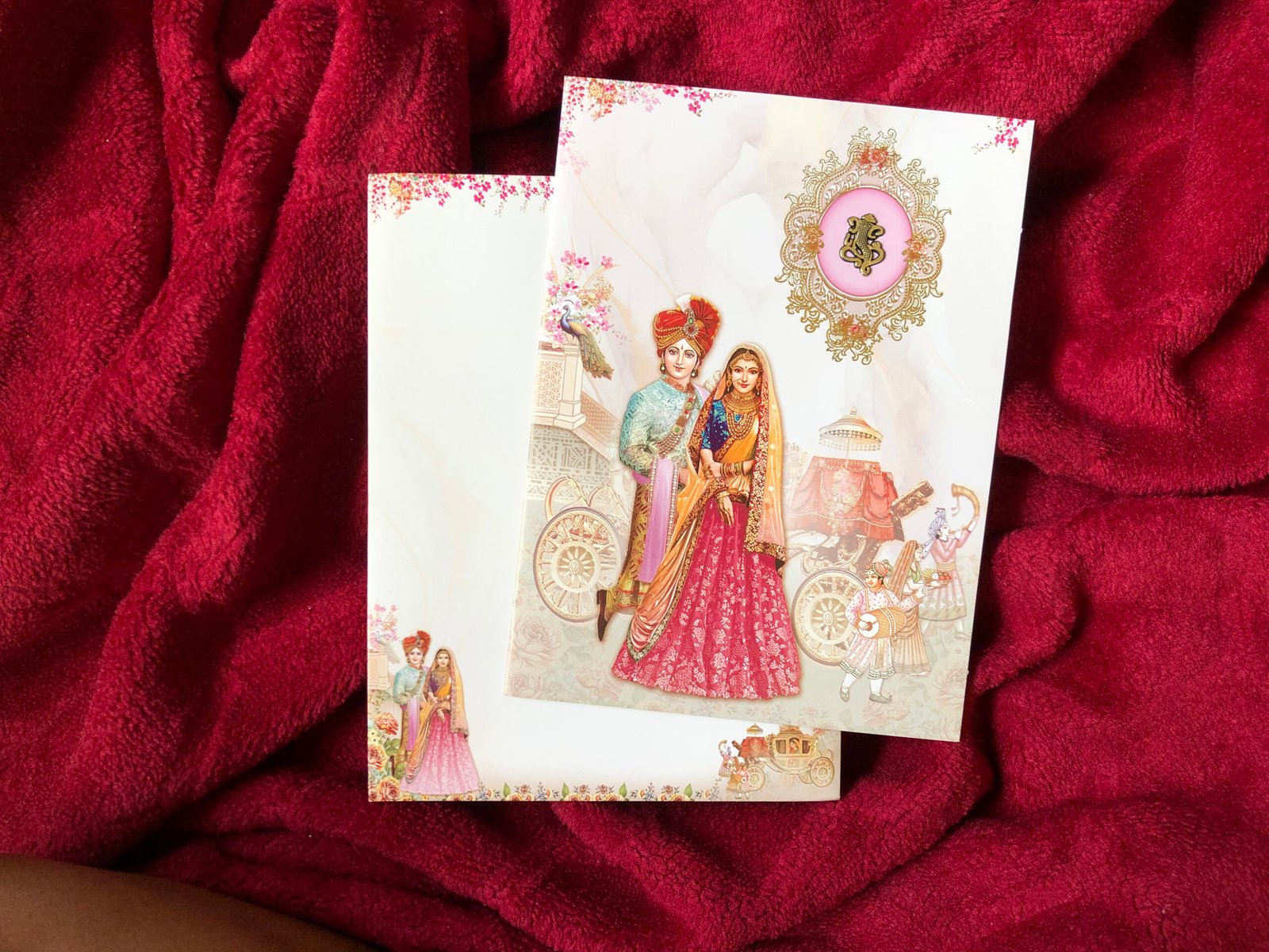 ₹18.00A classic white wedding card with a matching printed envelope, designed in the same serene white tone for a clean and sophisticated look. The card features a subtle floral print touch, adding grace and freshness to the overall design. Elegant gold printing highlights the headings and details, giving the invitation a royal yet modern appeal. Perfect for a timeless and refined wedding celebration.