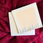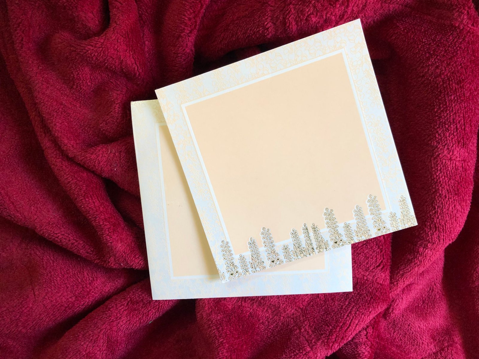 A simple peach colour wedding invitation with a matching envelope, both printed with a neat square border design. The card and envelope feature golden floral prints at the bottom, adding a soft shine and elegance. The overall look is minimal yet attractive, giving the invitation a clean, classy, and graceful appearance.