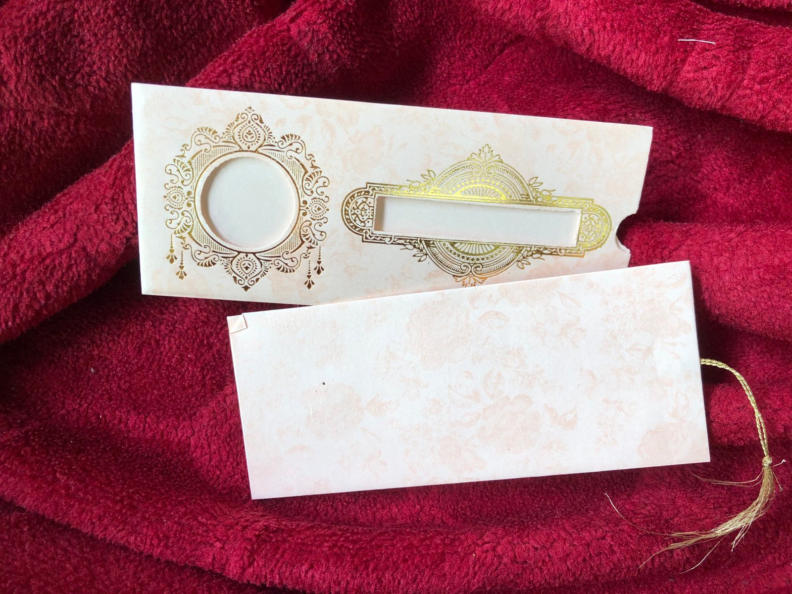 A simple and classy wedding card in a soft peach colour, paired with a matching envelope. Designed in a letter-style format and tied with a golden thread, it adds a touch of traditional charm. The golden printing enhances the look without making the design heavy, giving the card a clean, graceful, and modern feel. Perfect for couples who prefer a stylish yet minimal wedding invitation.