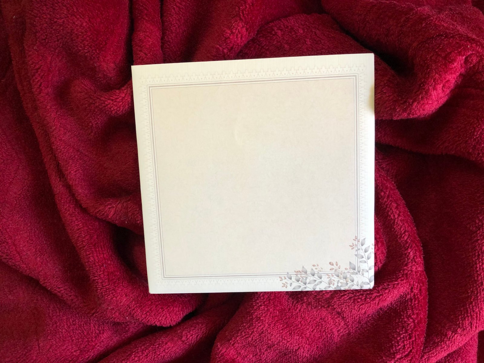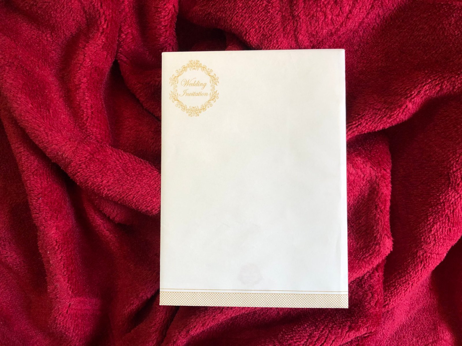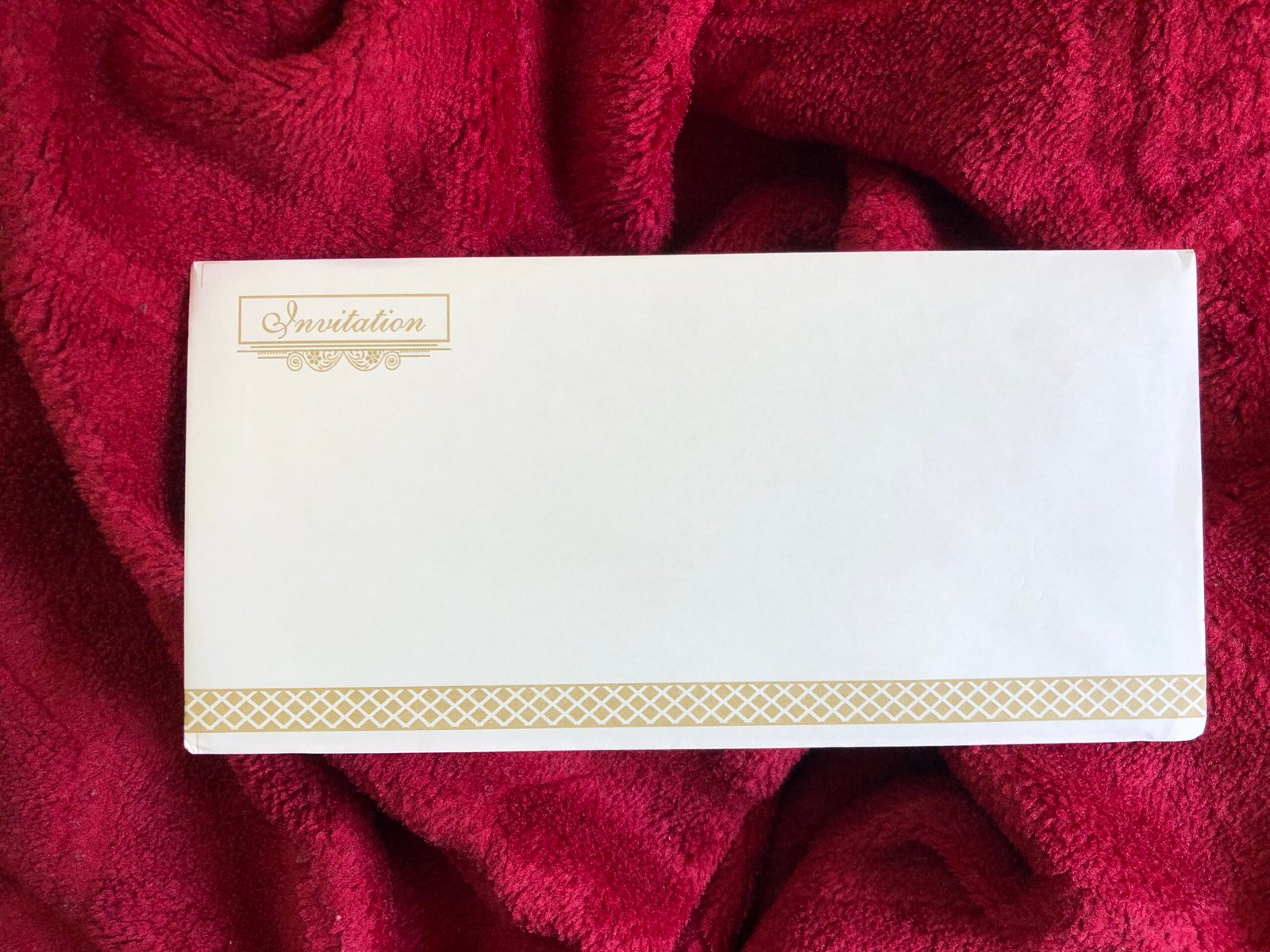 A cream textured wedding invitation card paired with a matching envelope, offering a clean and classic look. The front of the card features a Ganesh motif at the top, symbolizing blessings and auspicious beginnings, with a traditional baraat illustration at the bottom, adding cultural charm. Simple yet visually appealing, the design beautifully balances elegance and tradition, making it ideal for a graceful wedding announcement.