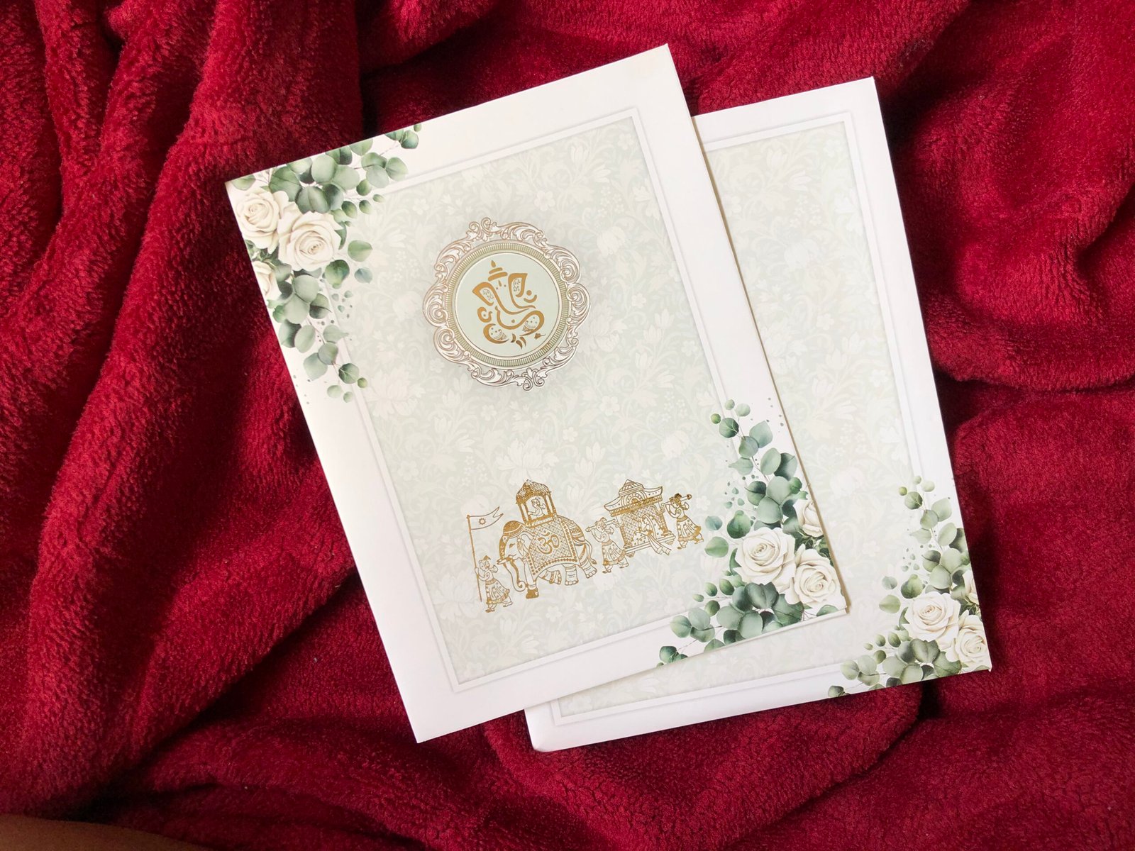 An elegant greenish wedding card featuring delicate rose flower borders at the corners, giving it a fresh and graceful look. The front is adorned with a gold printed Ganesh design, symbolizing blessings and prosperity. At the bottom, a Barati (wedding procession) illustration adds a traditional festive touch, making this invitation perfect for a stylish and culturally rich wedding celebration