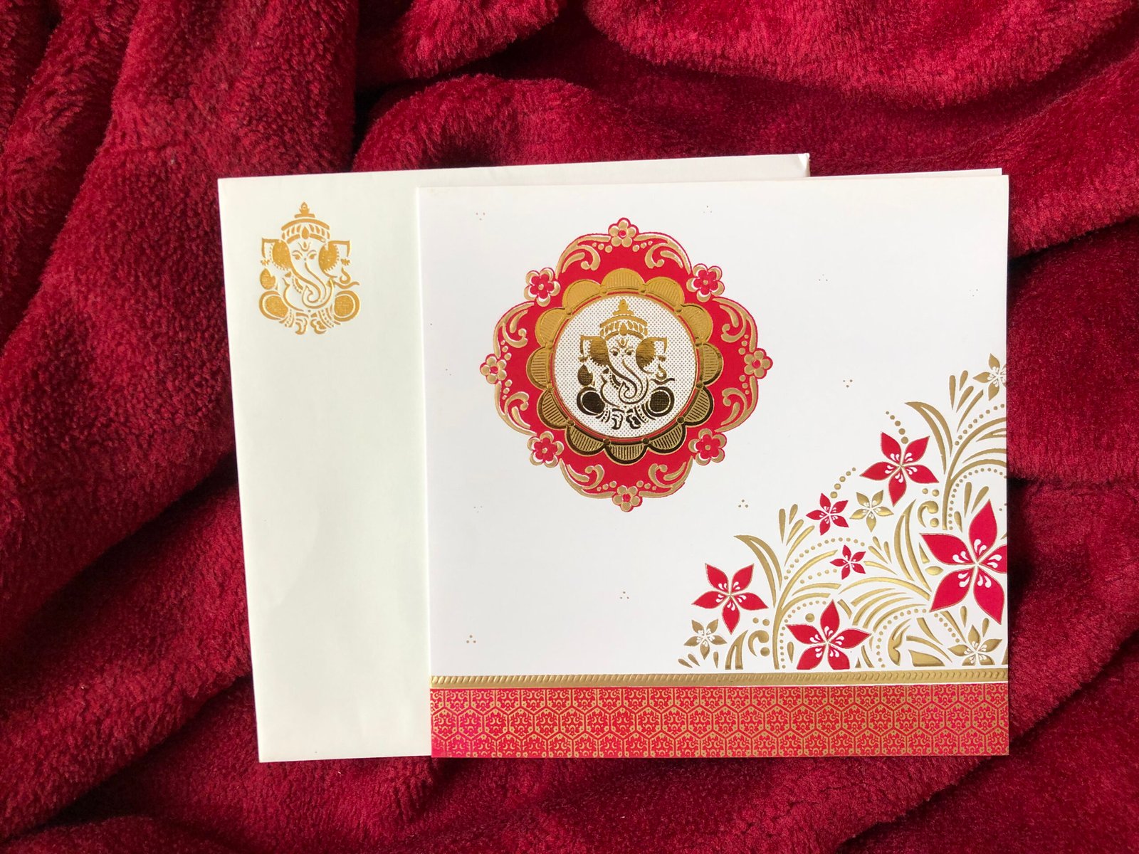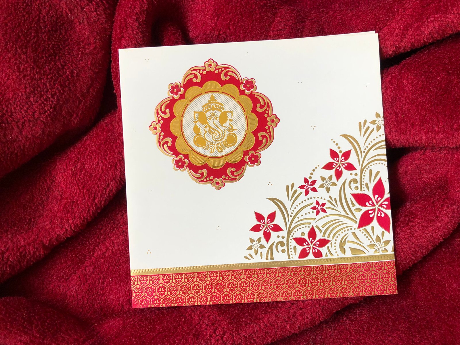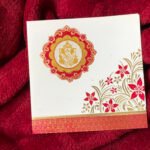 A graceful and traditional wedding invitation designed with a golden Ganesha symbol that brings auspiciousness to the card. The right side showcases a beautiful red and gold floral and leaf design, enhancing its decorative appeal. The lower section features a bold red patch with golden printing that adds richness and elegance. A perfect choice for couples looking for a simple yet classic Indian-style wedding invitation.
