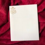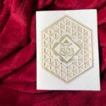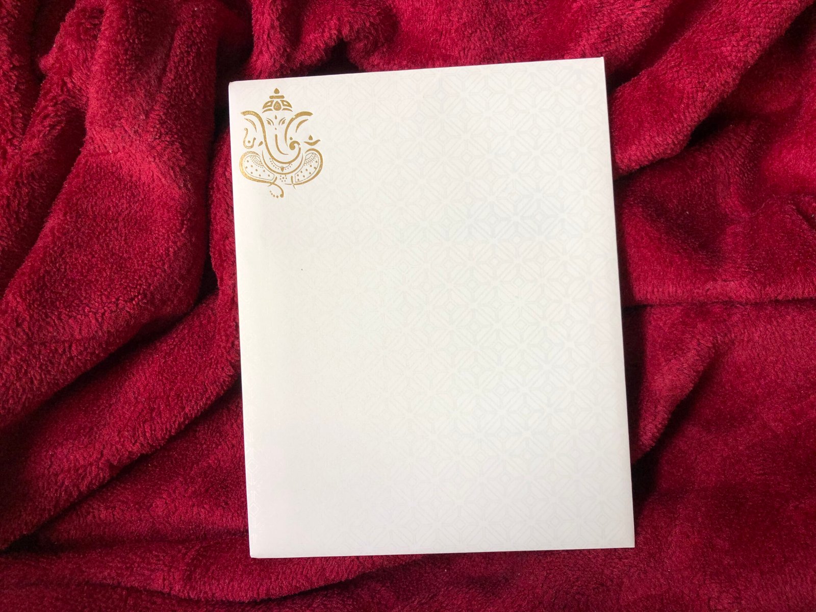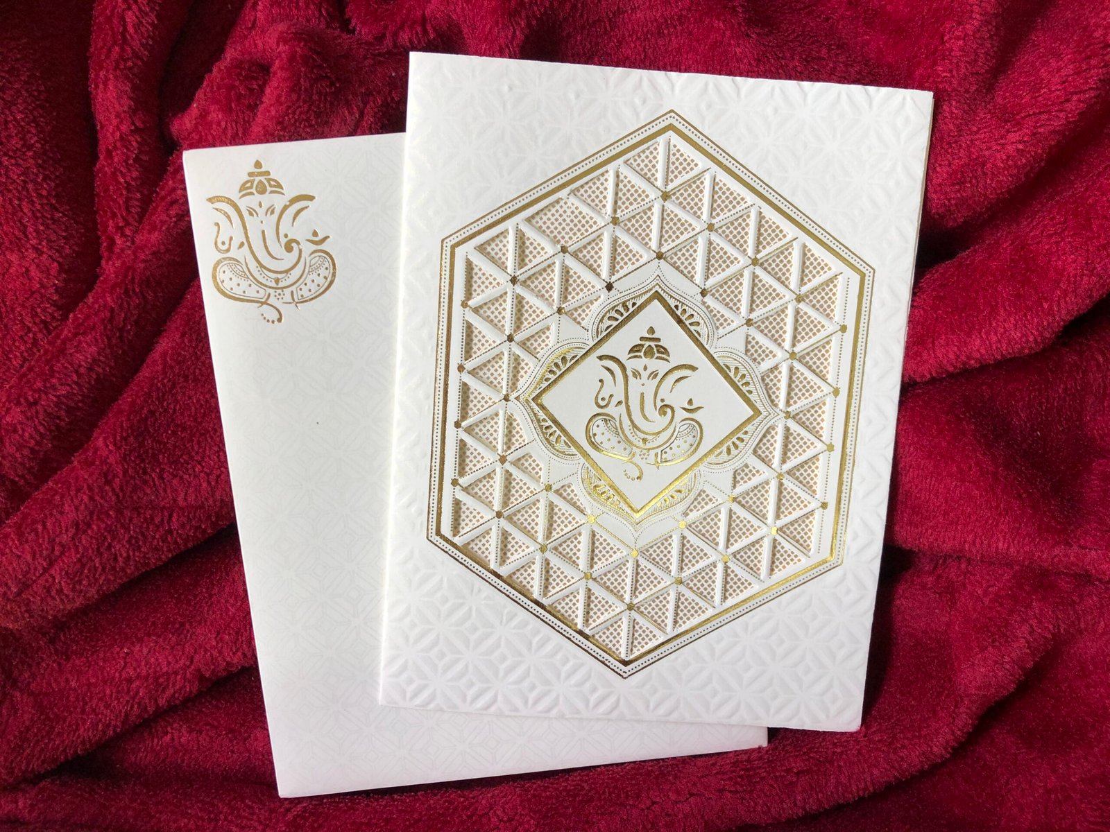 A stunning laser-cut wedding card in a unique hexagon shape, crafted in elegant white for a clean and modern look. The center features gold printing with a golden Ganesh motif, symbolizing auspicious beginnings. The invitation is paired with a matching white envelope printed in shiny white, completing the sophisticated and premium presentation. This design beautifully blends simplicity, tradition, and luxury, making it perfect for a stylish wedding celebration.