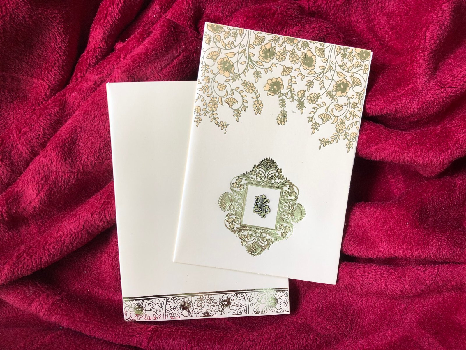 Elegant Floral Print Wedding Card with Golden Ganesh 013