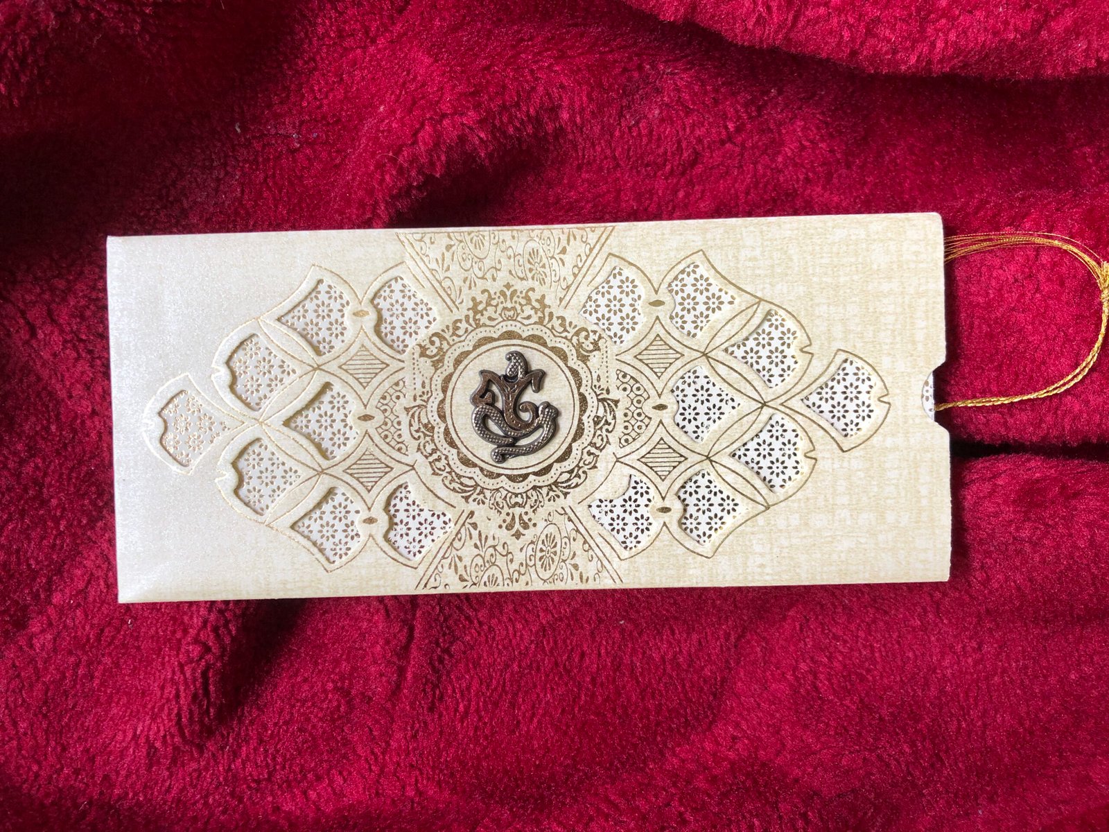 A simple yet elegant cream-coloured laser-cut wedding invitation, designed with refined traditional detailing. The outer cover features a delicate laser-cut pattern that adds a premium handcrafted feel. Inside, the invitation carries a golden Ganesha idol motif printed in rich gold foil, symbolizing blessings and prosperity.