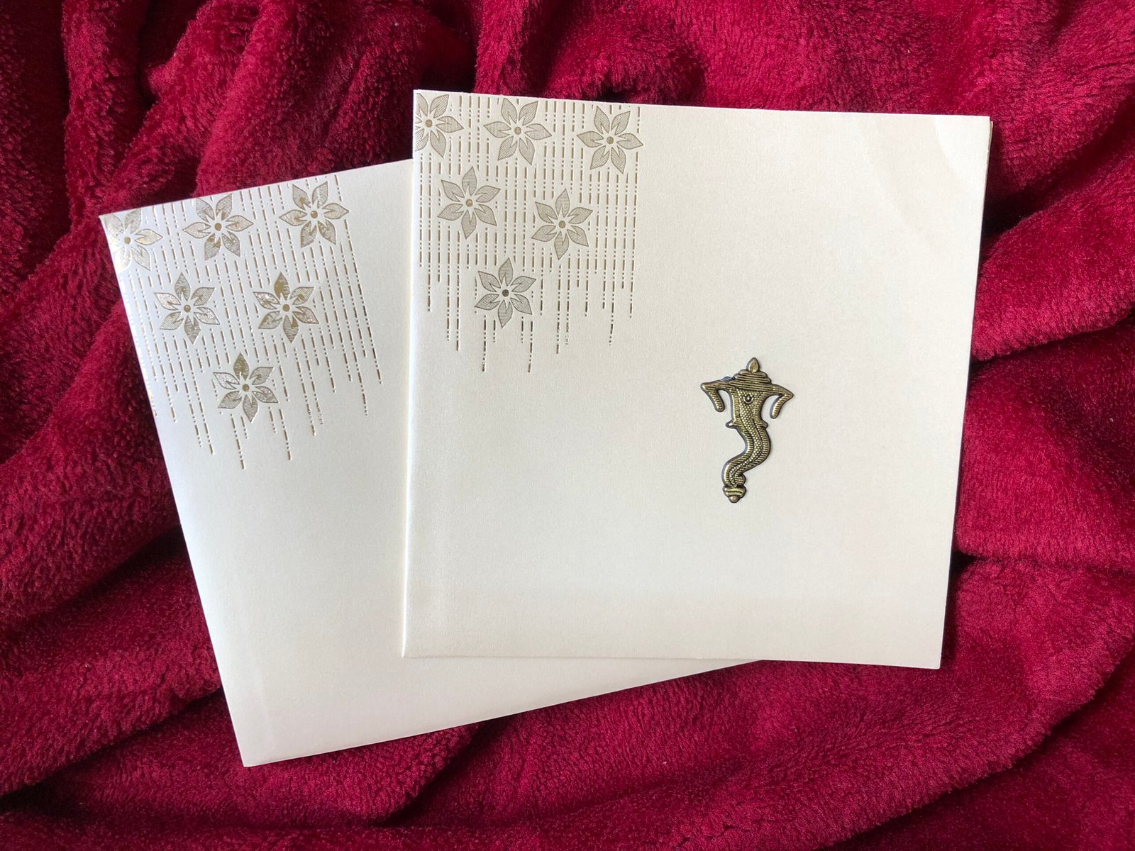 A simple yet classy cream wedding invitation card featuring a golden Ganesh clipart on the front. The left-side corner flower print in gold adds a subtle decorative touch, giving the card an elegant and stylish look. Perfect for those who prefer a refined, traditional, and sophisticated invitation design.