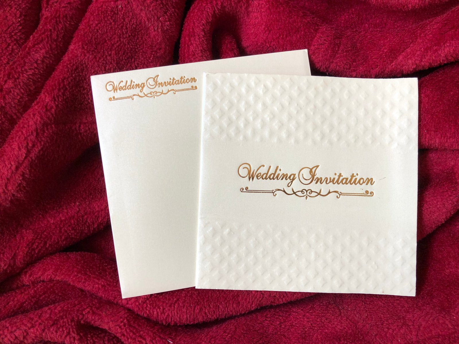 A beautifully crafted wedding invitation designed on a soft cream-coloured card, featuring luxurious gold embossed lettering that adds a royal and timeless touch. The elegant gold detailing enhances the names and event highlights, giving the invitation a classic and sophisticated look. Perfect for a traditional yet modern celebration, this card reflects grace, warmth, and the grandeur of the wedding it announces.