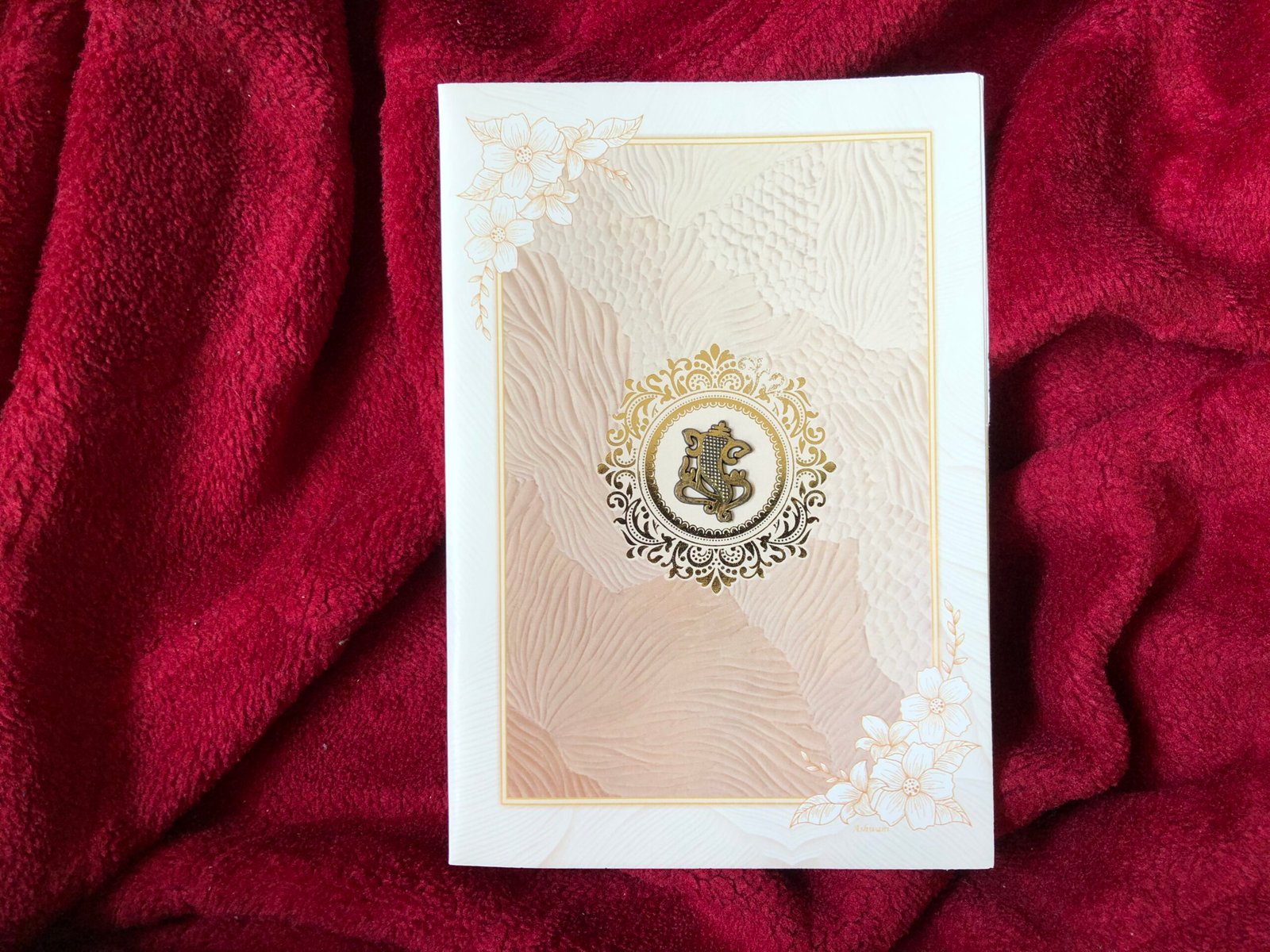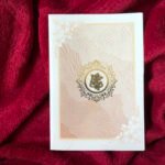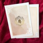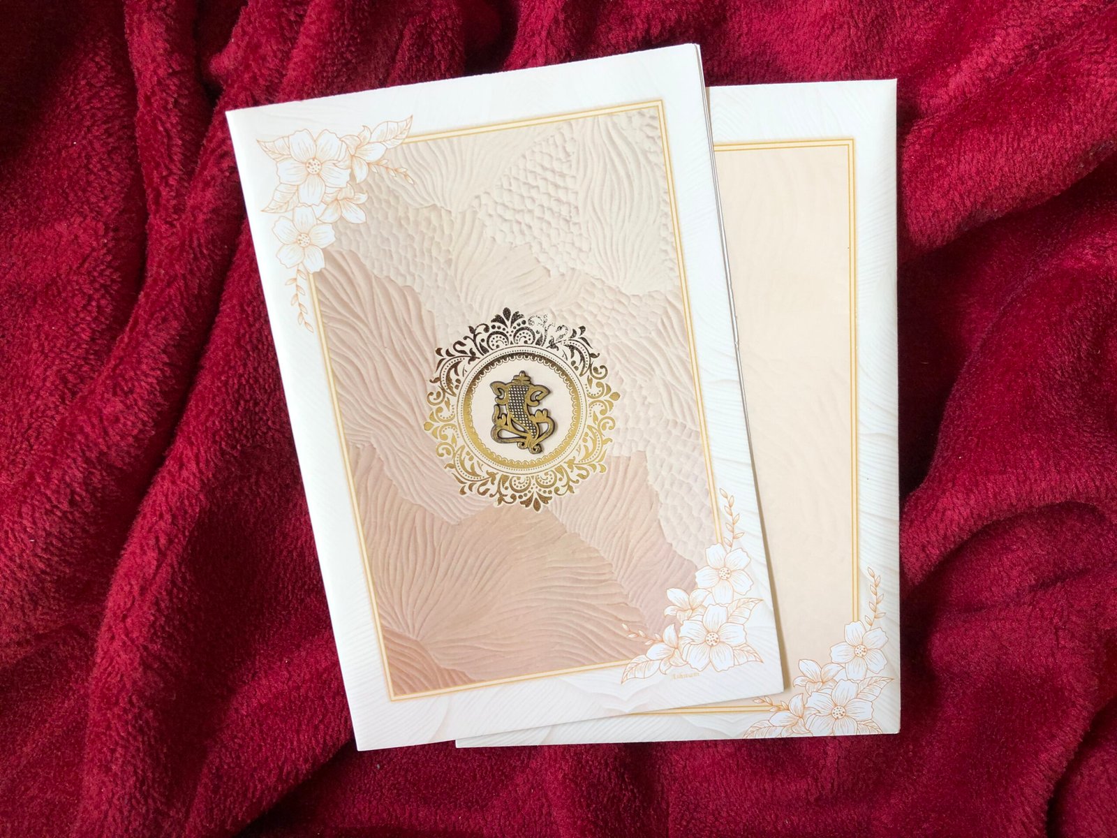 A beautiful wedding invitation featuring a light brownish background with white accents, highlighted by delicate hibiscus flower prints that bring a fresh and graceful look. The design is adorned with a golden Ganesh clipart, symbolizing blessings, prosperity, and auspicious beginnings. The overall combination of colors and elements creates a warm, traditional, and stylish appearance, perfect for announcing a joyful new chapter.