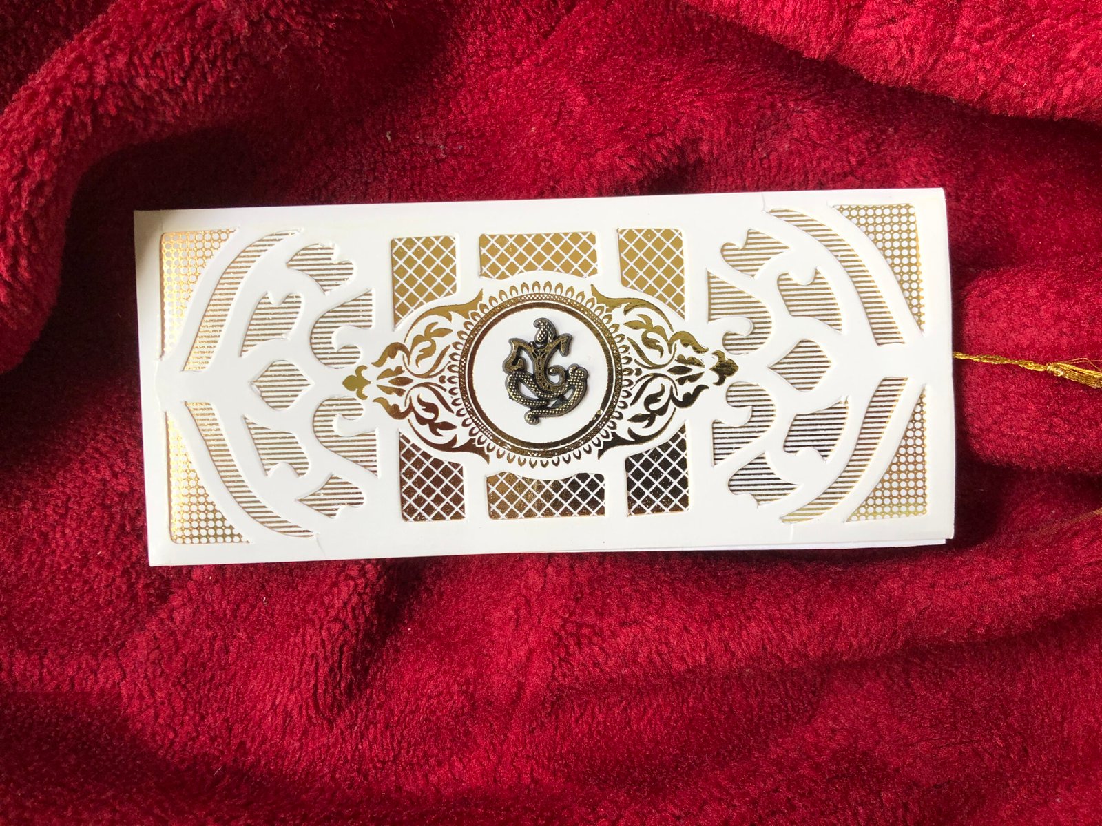 White laser-cut wedding card with elegant golden printing. The front features a beautiful golden Ganesha clipart, making the card look attractive and auspicious. Inside, the invitation comes in a letter-style folding card, neatly tied with a golden thread, giving it a premium, simple, and traditional look. The mix of white laser-cut detailing and gold accents creates a classy and graceful appearance.