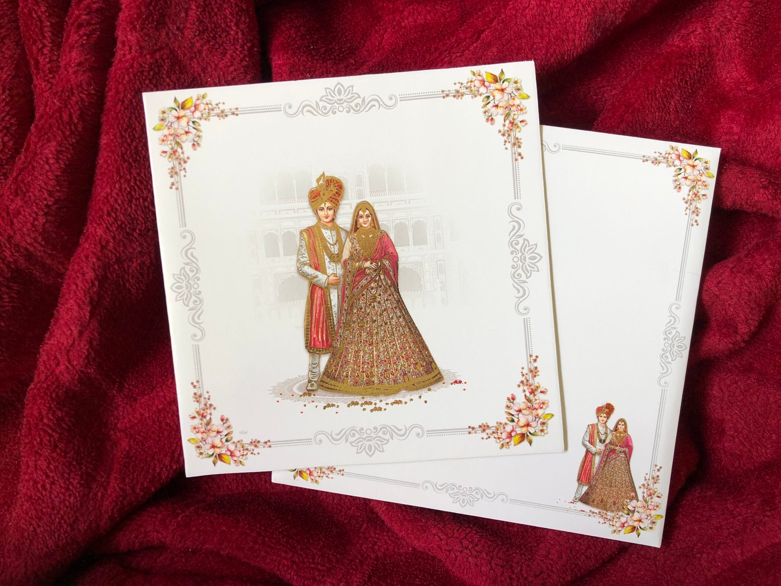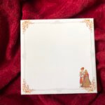White colour wedding card with elegant floral corner borders on the envelope, giving it a soft and classy look. The envelope also features a traditional bride–groom illustration on the right side bottom, adding a rich Indian touch.