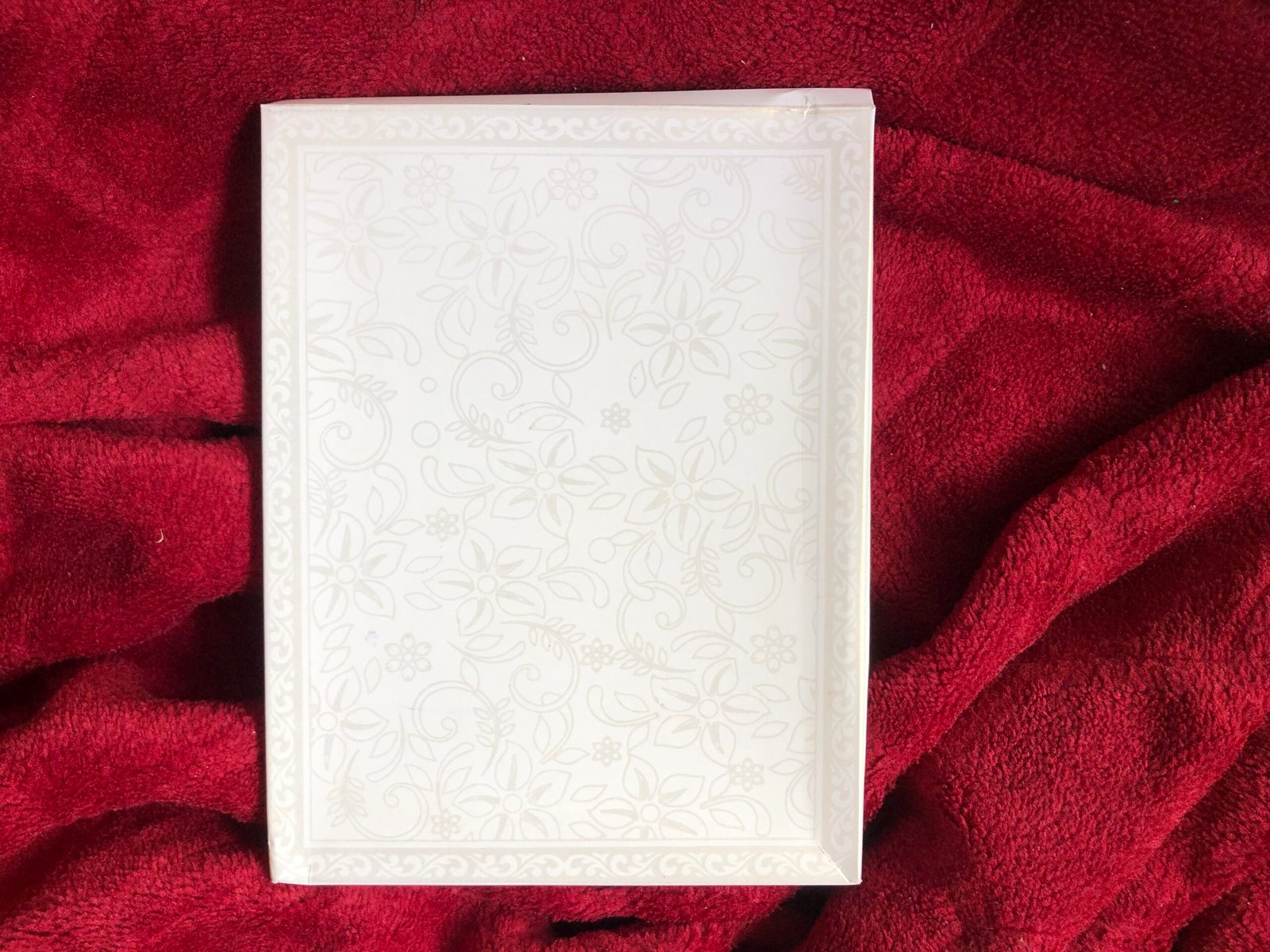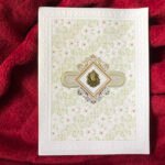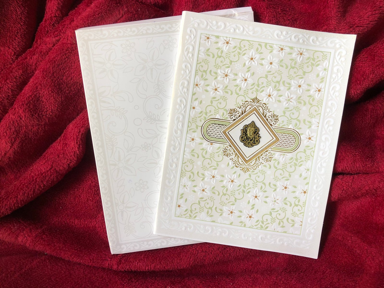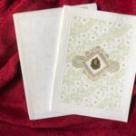 Off-white invitation card and envelope with a soft, elegant look. The envelope features a light silver floral print, giving it a subtle and classy finish. The main card has a golden Ganesha clipart in the centre with a neat golden printed border, making it the main attraction. The full front side of the card is decorated with a floral design in light greenish and white embossed texture, adding richness and depth. Overall, the off-white base, silver floral print, golden detailing, and embossed finish create a simple yet premium-looking card.