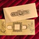 The background has a subtle textured pattern that enhances the ethnic look of the card. A delicate golden thread tie on the side gives it a pouch-style finish, making it look traditional and premium.