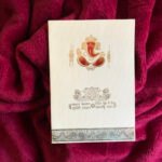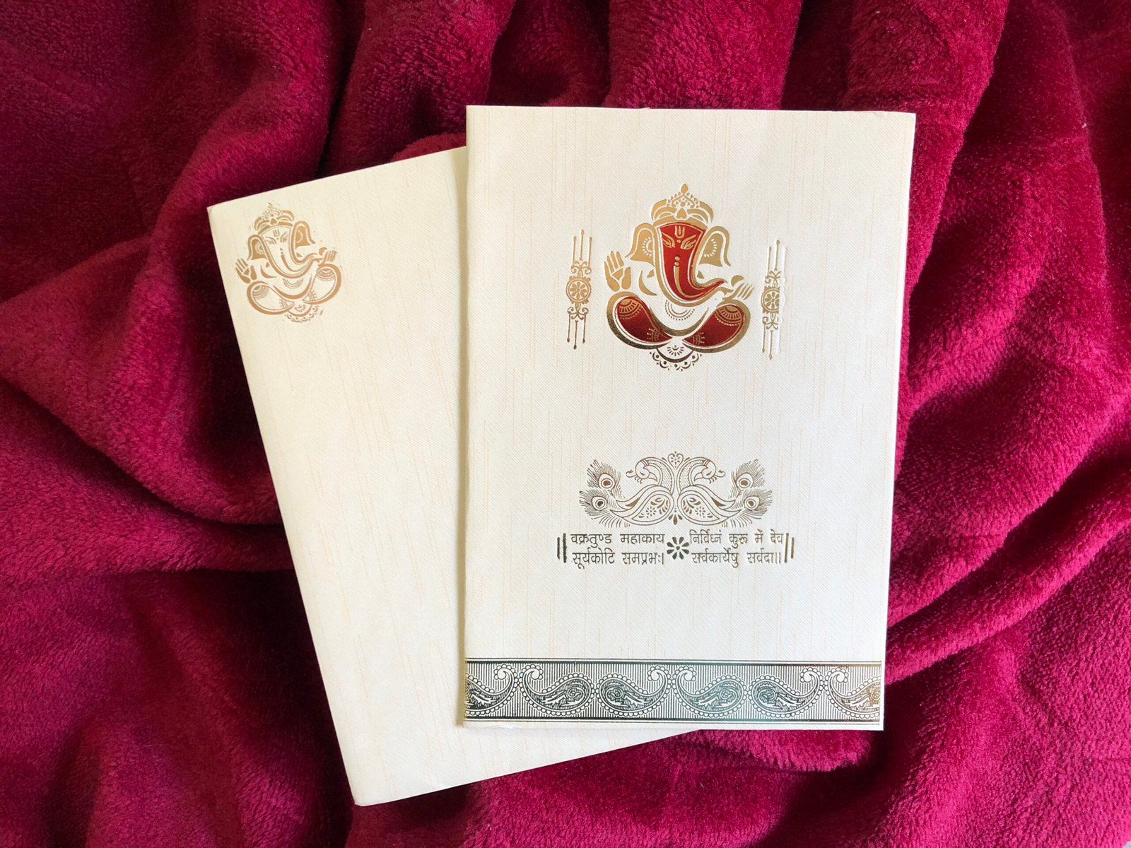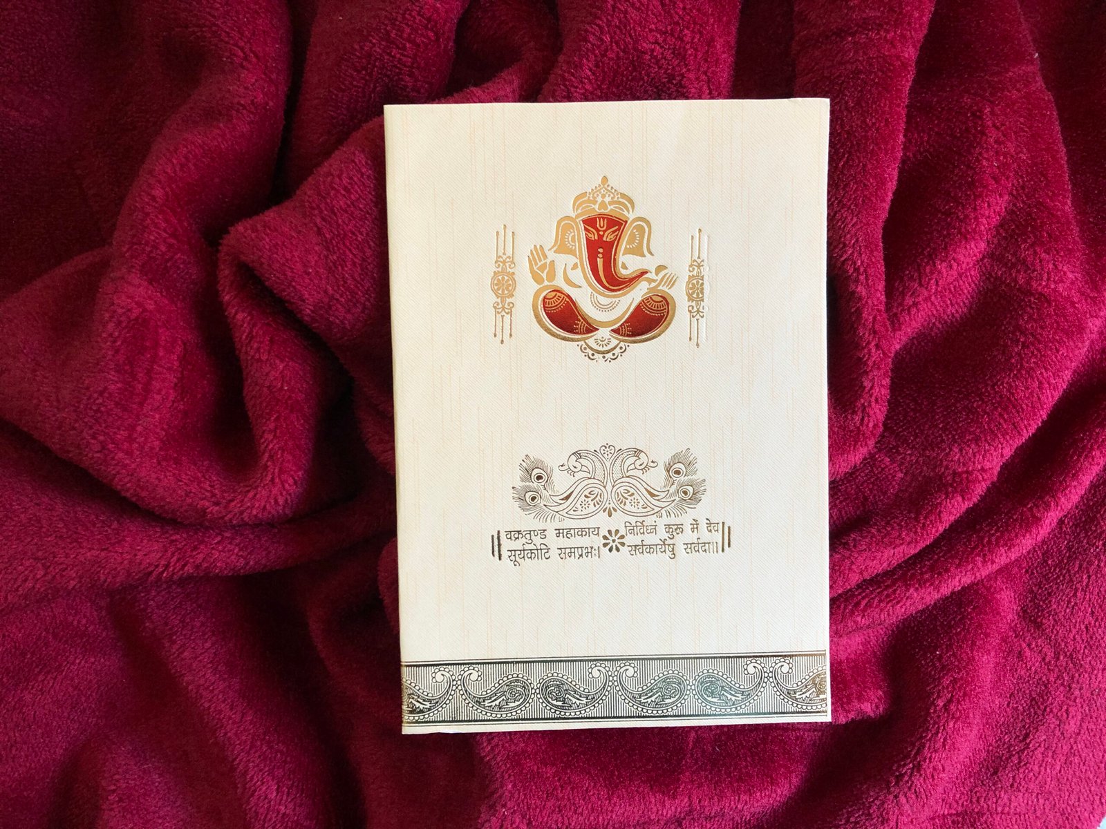 “Simple wedding invitation card featuring a sacred Lord Ganesh print at the top. Below it, the Ganesh shlok