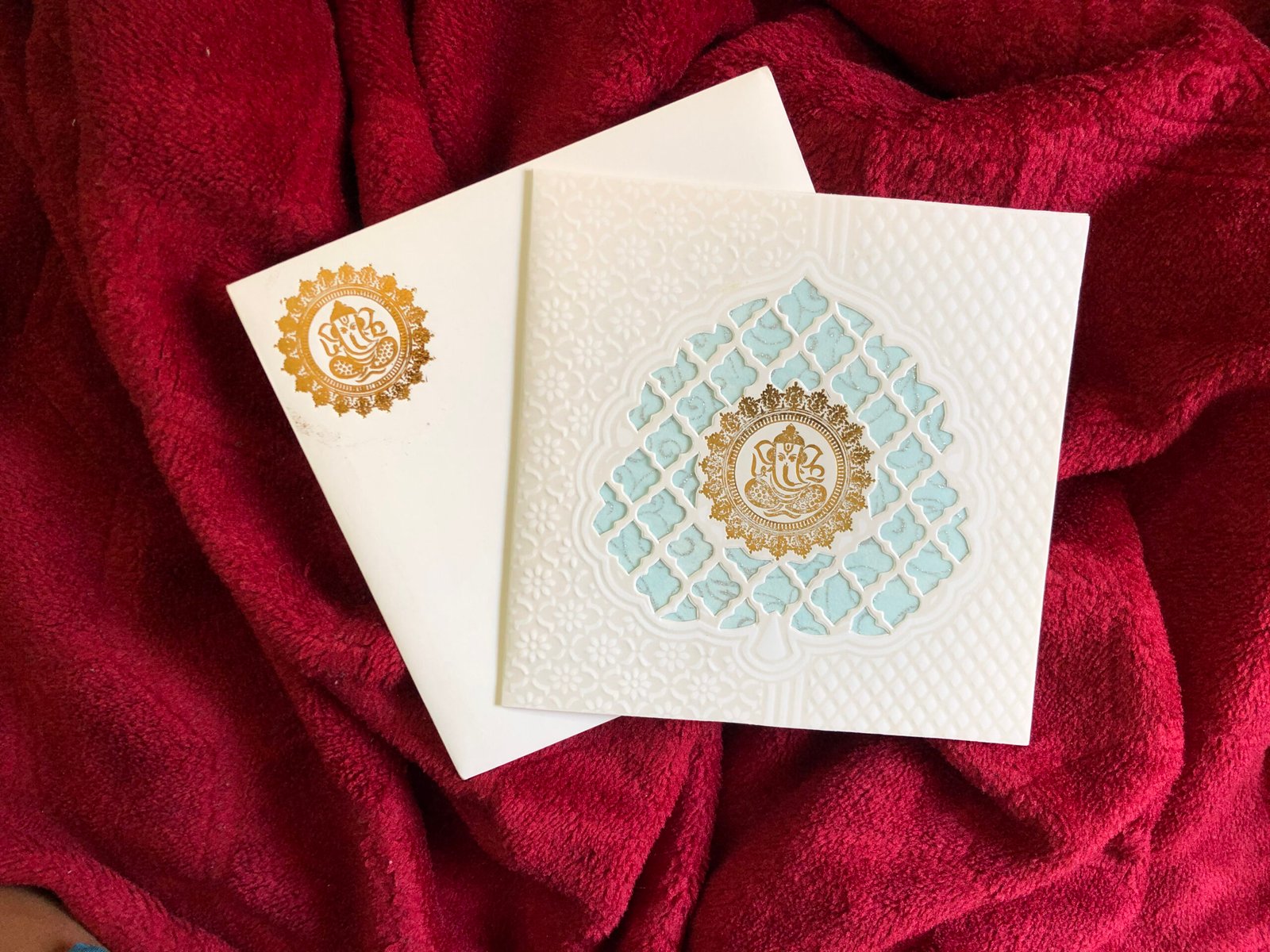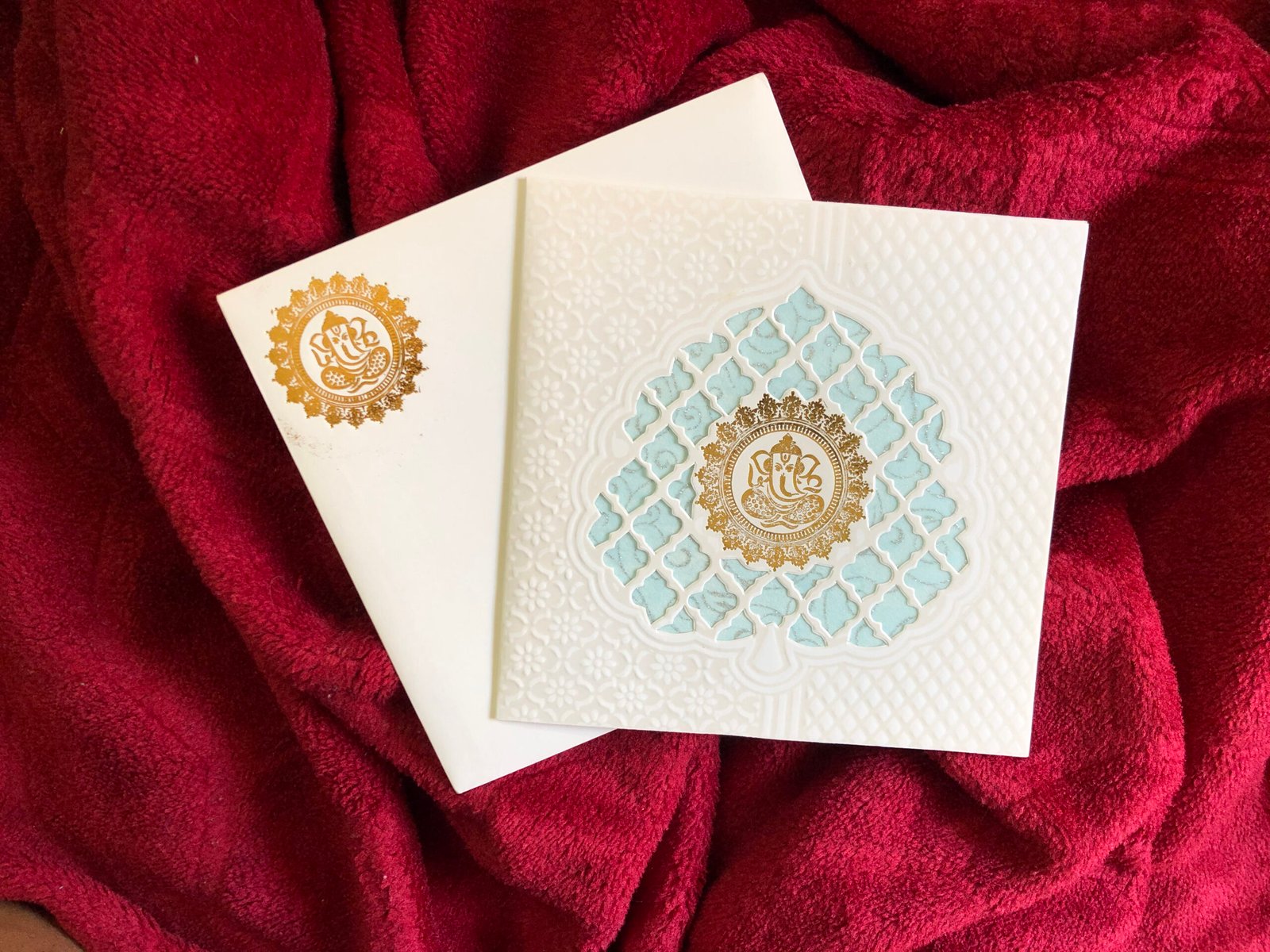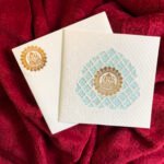 “White and light blue wedding invitation card designed with a delicate laser-cut leaf pattern. The soft cutout shape adds a graceful touch, while a golden Ganesh print enhances the auspicious feel. The minimal color palette and clean layout give the card a simple yet rich and classy appearance.”