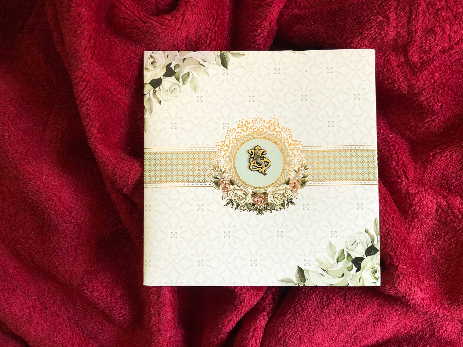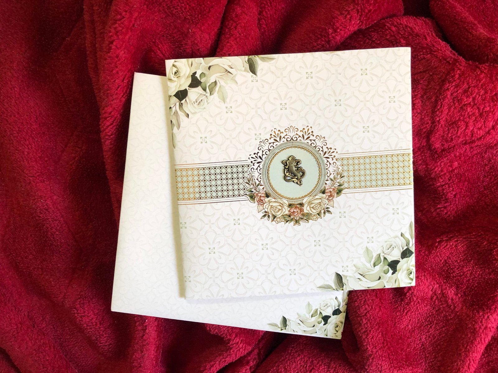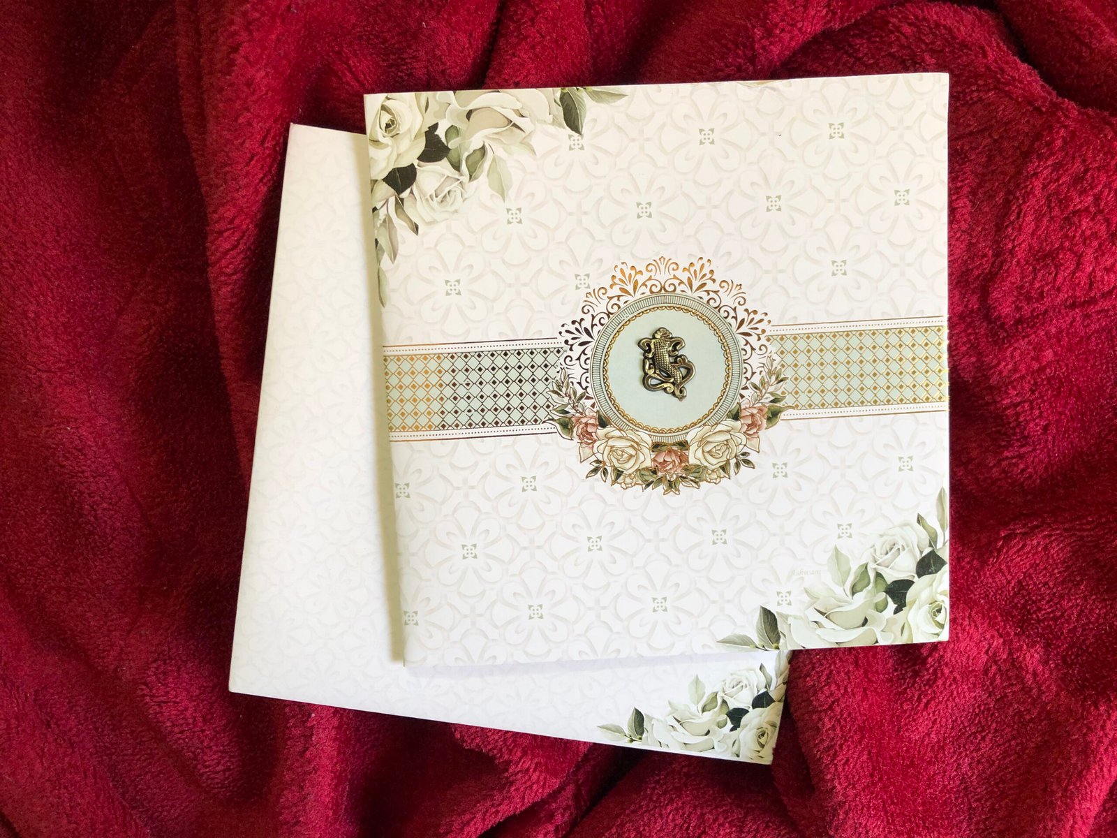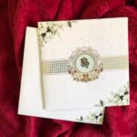 “White colour wedding invitation card with matching envelope. The card features delicate rose clipart on the corners, adding a soft floral touch. The minimal white base and subtle detailing give the invitation a simple yet rich and elegant look.”