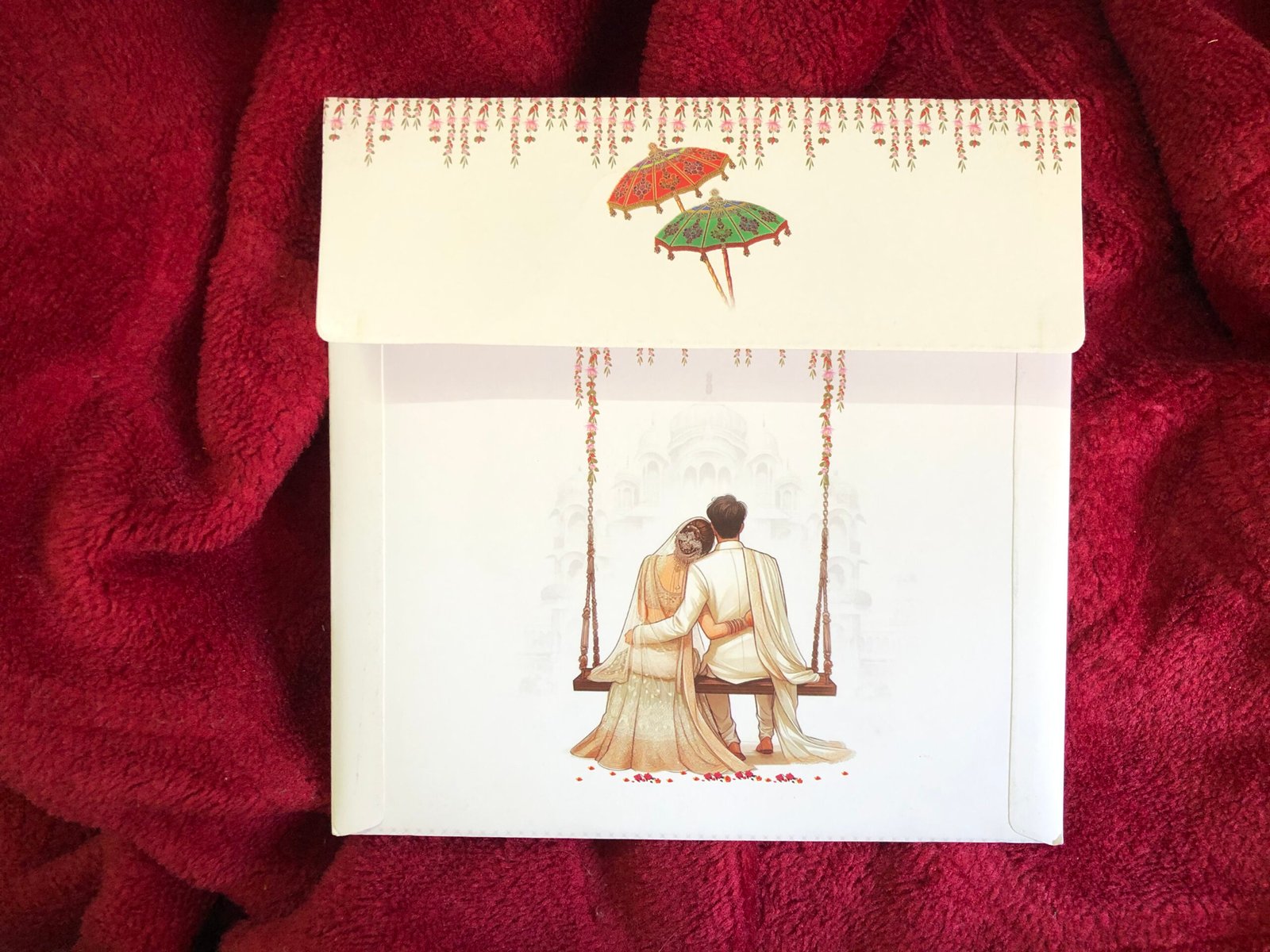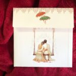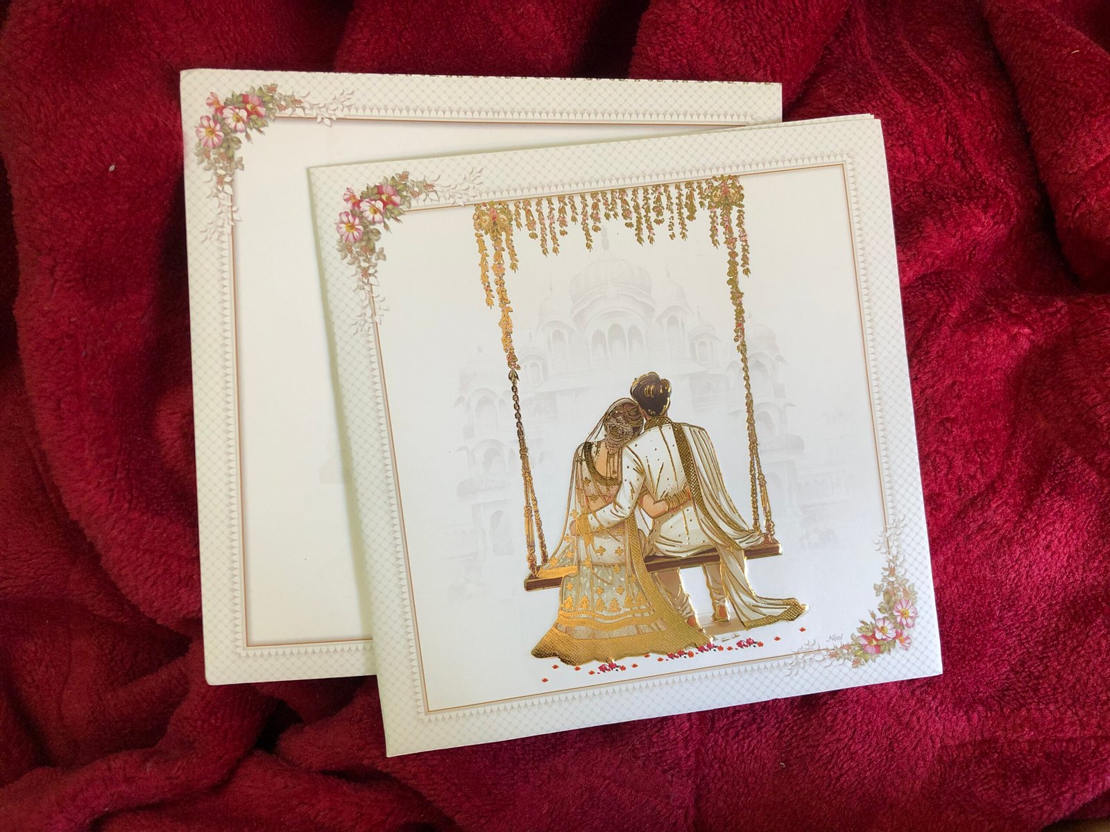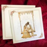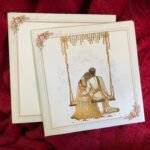 “Traditional wedding invitation featuring a bride and groom sitting on a royal swing, beautifully printed in rich golden foil. The detailed foil artwork looks stunning and is complemented by a palace-style printed background, giving a princess-like royal appearance. The overall design feels luxurious, elegant, and rich, perfectly capturing a timeless traditional look.”