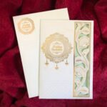 “Simple laser-cut wedding invitation card in cream colour with shiny gold paper. The delicate cutwork design looks beautiful and elegant, adding charm while keeping the overall appearance minimal, classy, and graceful.”